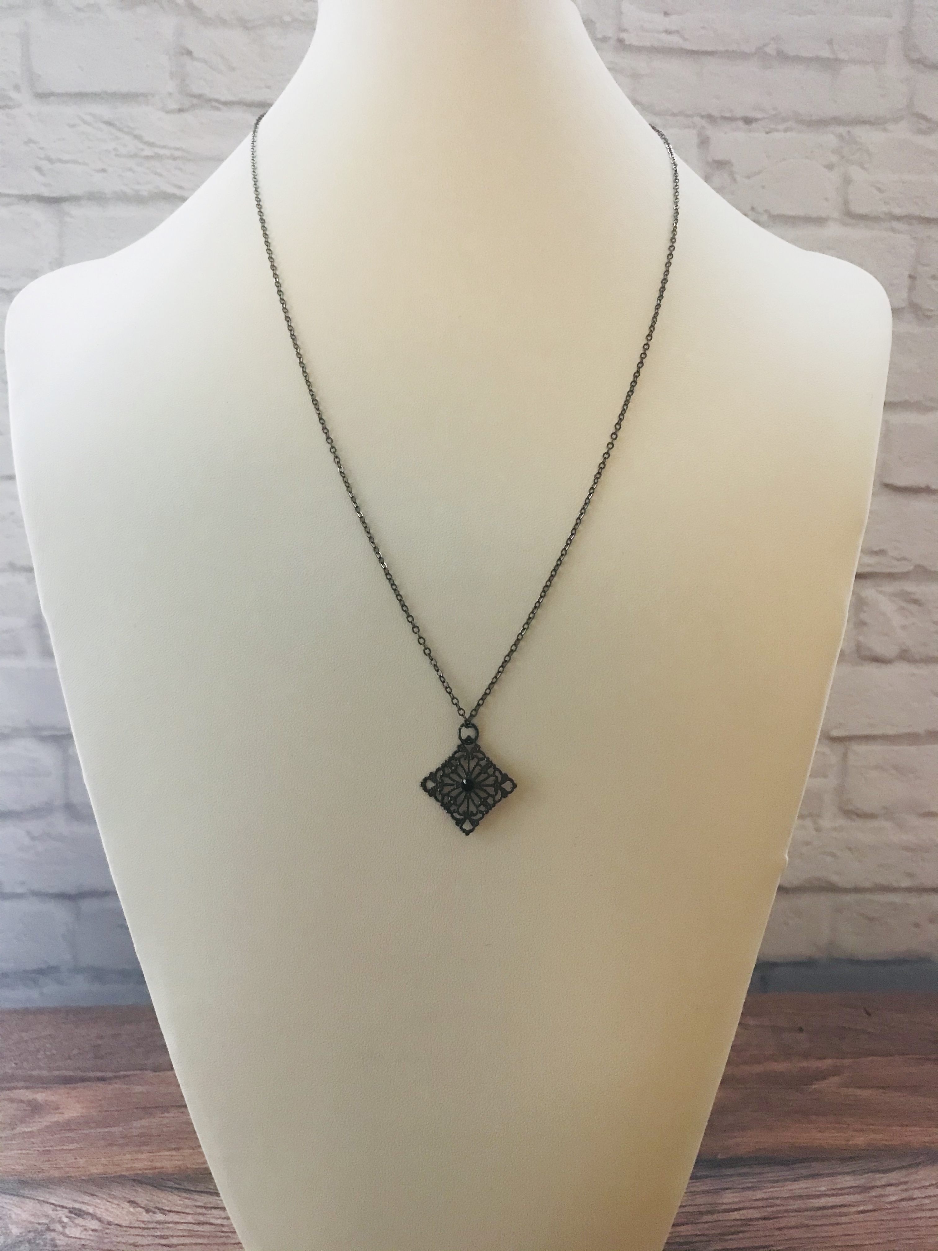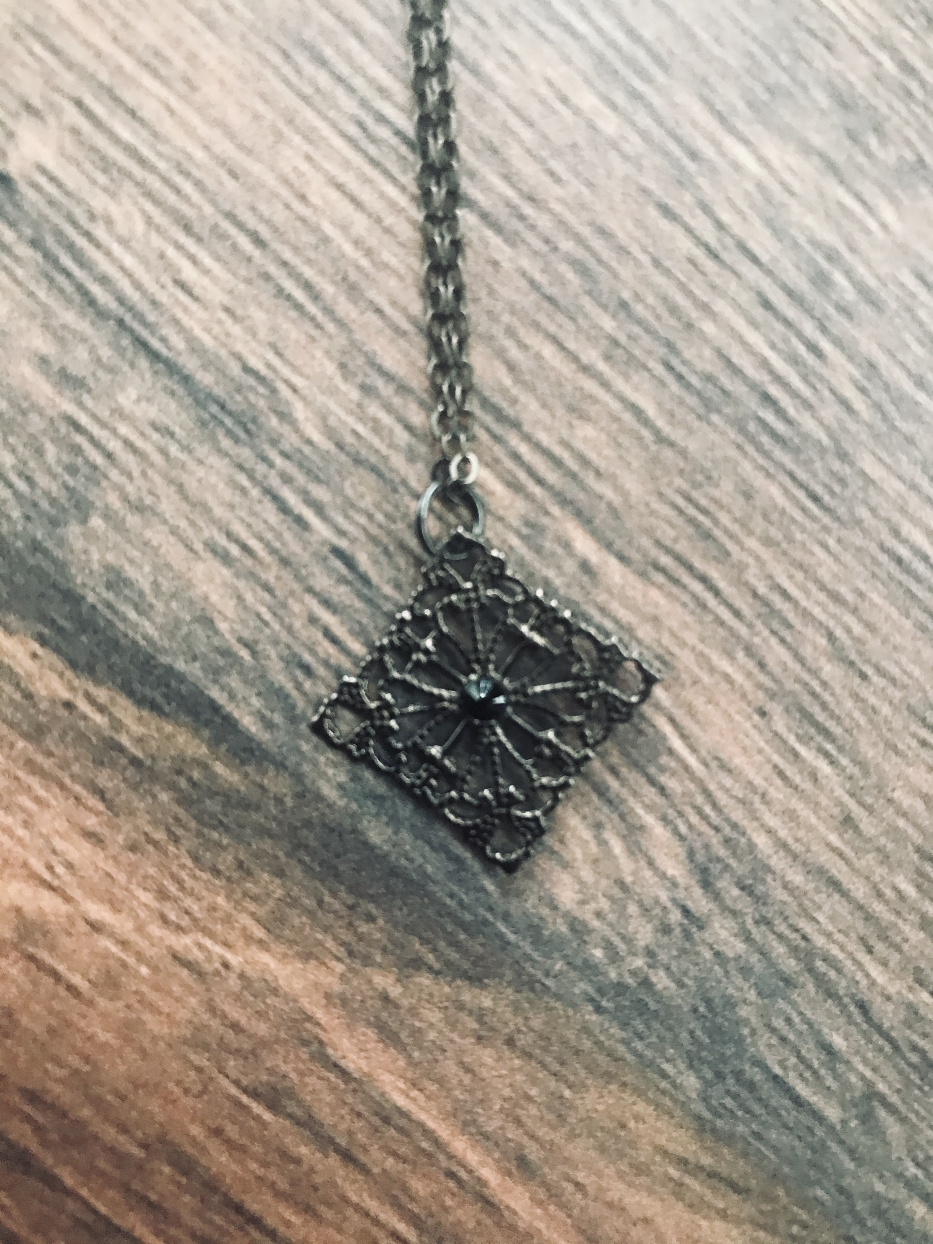 Inspired by my recent postings of ghost stories, I am showcasing one of the necklaces I sell in my store. This necklace is simple, gorgeous and haunting. It has an antique gunmetal plated filigree with two jet black Swarovski applique stones. The filigree is fastened onto a 22- inch cable chain with a lobster clasp for easy fastening.